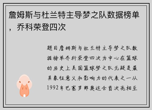 詹姆斯与杜兰特主导梦之队数据榜单,乔科荣登四次