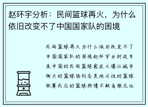 赵环宇分析:民间篮球再火,为什么依旧改变不了中国国家队的困境