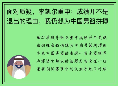 面对质疑,李凯尔重申:成绩并不是退出的理由,我仍想为中国男篮拼搏