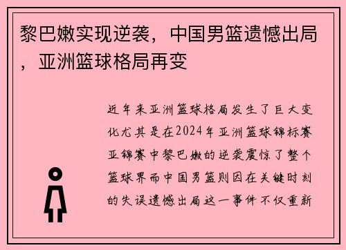 黎巴嫩实现逆袭,中国男篮遗憾出局,亚洲篮球格局再变
